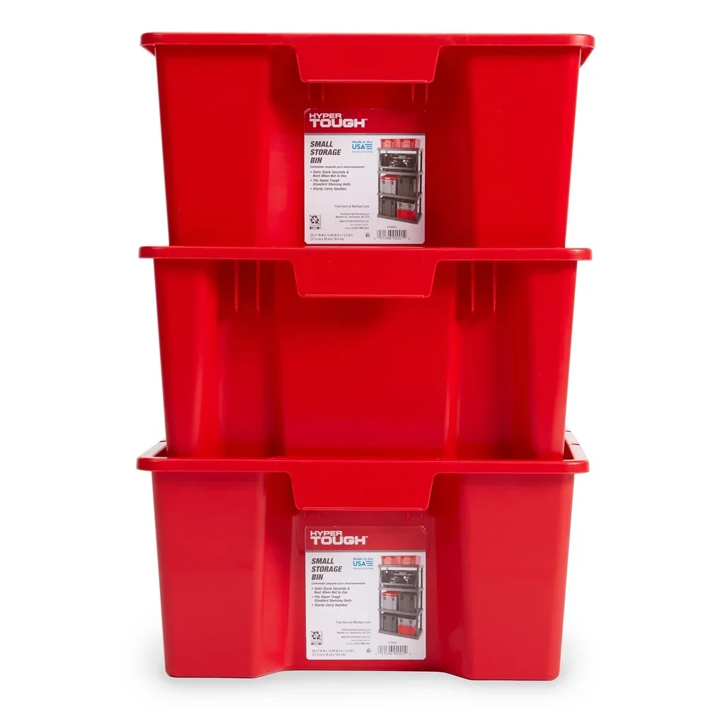 When you are looking to organize your garage or storage space, this 14. 7 Gallon  Storage Bin is perfect.  Stacks for vertical storage as well.  Conveniently nests inside itself when not in use.  Can also stack on the large and medium bins.  Made of durable plastic and are rust, water and corrosion proof.  Durable handles for easy portability.